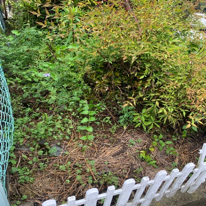 お庭全体に雑草が繁茂し、低木の周りも草に覆われていました。