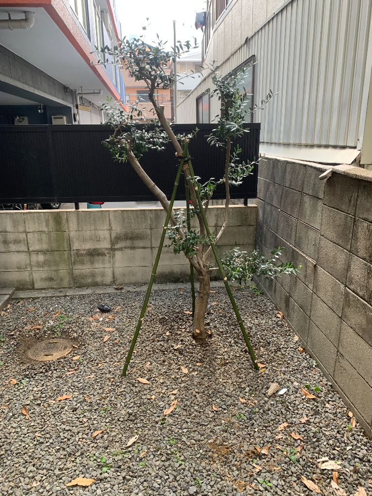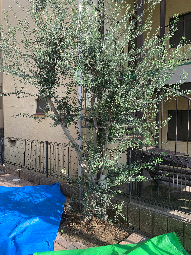 大阪市十三の施設でオリーブ1本を移植|植木屋藤一の施工事例